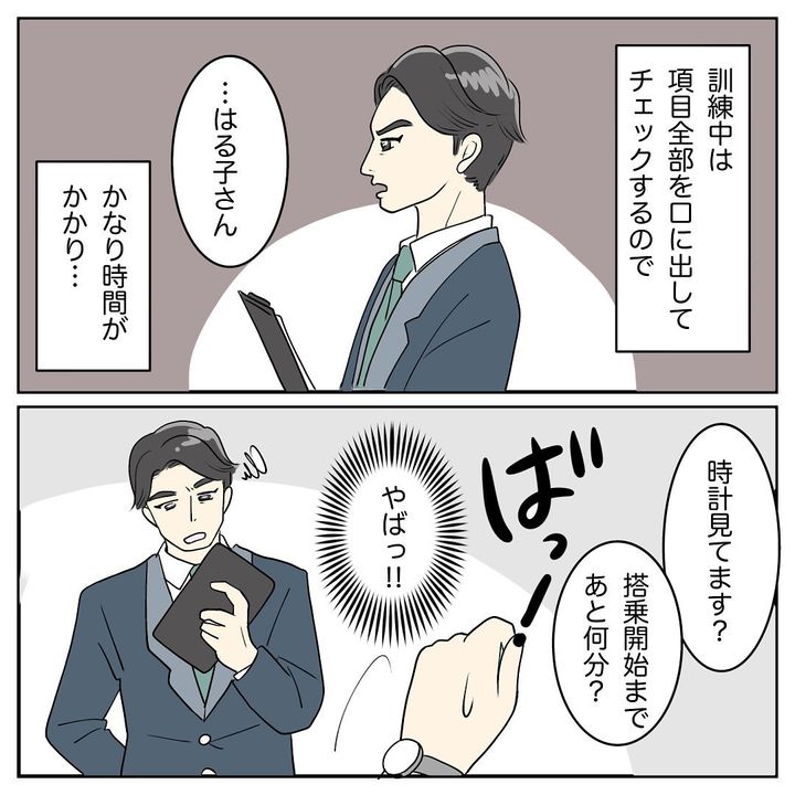 いよいよ始まったOJTフライト。キマグレさんの知識確認と、ブリーフィングでの知識確認を無事にクリアし、飛行機に到着します。訓練中は確認項目を口に出してチェックするため、作業に没頭していると、いつの間にか搭乗時間が迫っていたようです。