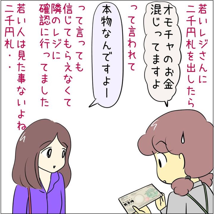 さらに、2000年に発行された二千円札を知らない子もいたようです。レジで支払われた二千円札を見て、オモチャだと勘違いしてしまったとは驚きですね。つい最近、発行された感覚でいる世代の方にとっては、ジェネレーションギャップを感じずにはいられないエピソードなのではないでしょうか。