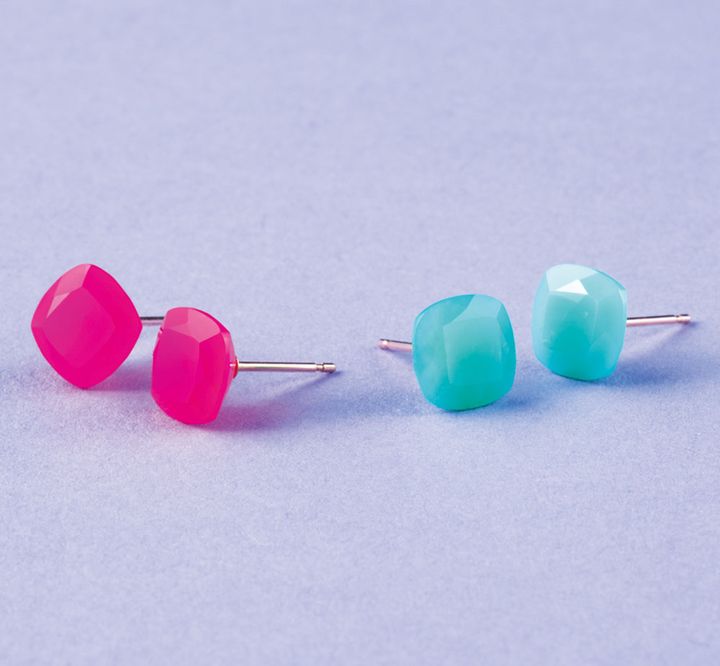 キャンディーカラーの天然石。〈右から〉ピアス〈クリソプレーズ〉ピアス〈ピンクカルセドニー〉(ともにコロル×シンゾーン/シンゾーン ルミネ有楽町店)