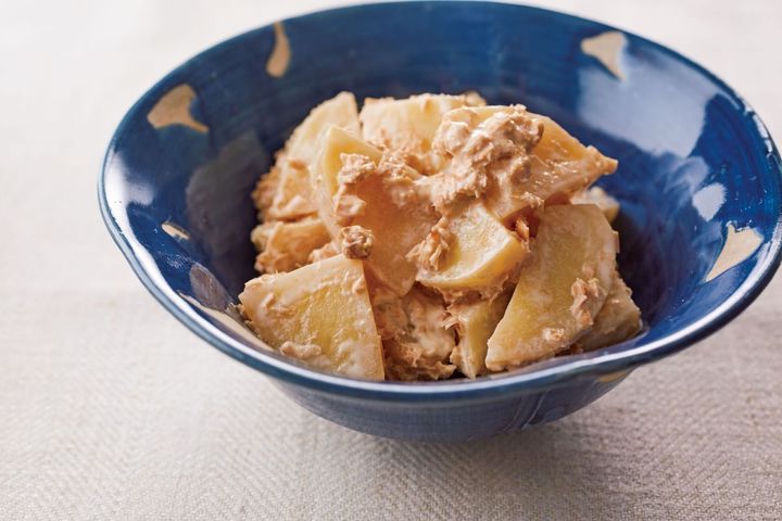じゃがいもは皮をむいて小さめの一口大に切る。3分ほど水にさらしてかるく水けをきる。耐熱のボールに入れ、ふんわりとラップをかけて電子レンジ(600W)で4分加熱する。水けをきり、おかかマヨだれの材料を加えて、あえる。