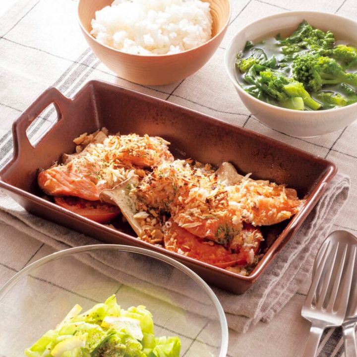 自身も半年でマイナス20kgを達成した管理栄養士の前田量子さんに、痩せるために大切な5つの栄養素を意識して取り入れた、痩せパターン献立を教えてもらいました。今回は「鮭とトマトとエリンギのパン粉焼き」もレンジでできちゃう洋夕食献立の作り方をご紹介します。