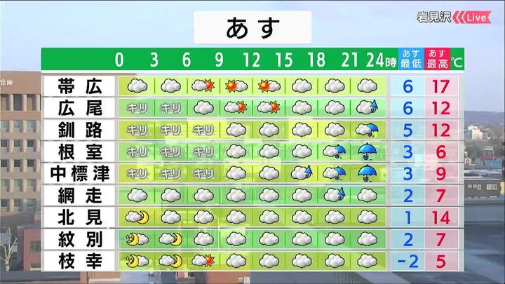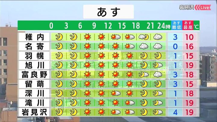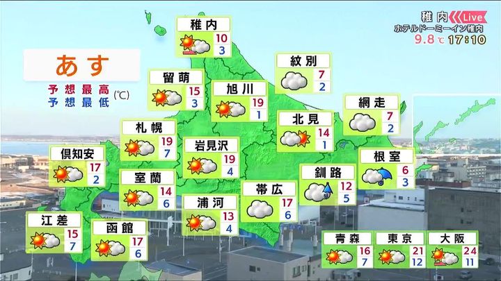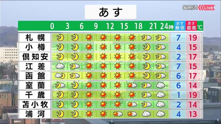 日本海側や道南は晴れて、最高気温は岩見沢で19度です。道東方面は曇って、根室の最高気温は6度でしょう。