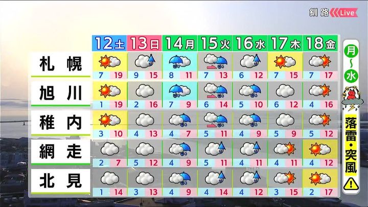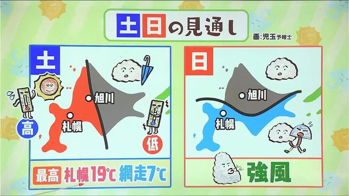 あす12日(土)は、日本海側や道南は晴れて、札幌の最高気温19度です。道東方面は曇って、霧雨や小雨のぱらつくところもあるでしょう。網走の最高気温は7度でヒンヤリします。日曜日は太平洋側や札幌周辺でも雨が降り、全道的に風が強まるでしょう。土曜日のうちにいろいろ用意しておいた方がいいですね。