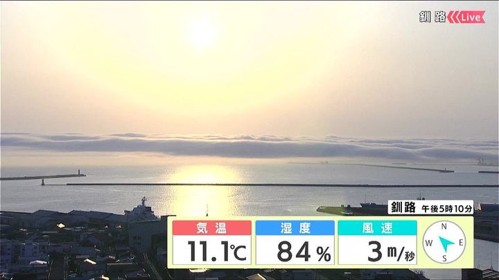 釧路では晴れていますが海には低い雲がかかってます。11日夜から霧がかかり、あす12日は霧雨や小雨が降るでしょう。