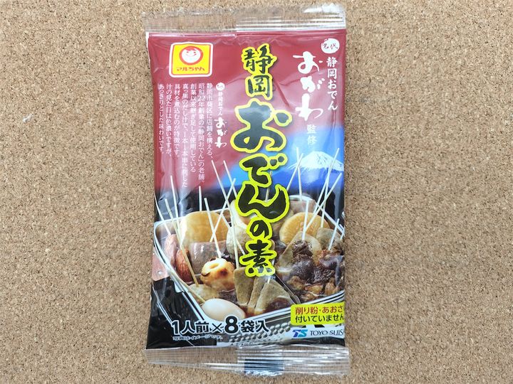 冬場のグルメ番組でおでん特集があると必ずと言っていいほど取り上げられるのが静岡おでんですが、ご当地おでんというくらいですから、実際に静岡に行かないと食べられないとずっと思っていました。ところがあの赤いきつねなどで有名なマルちゃんから発売されたのがこの、「静岡おでん おがわ監修 静岡おでんの素」148円(税込 159円) 。