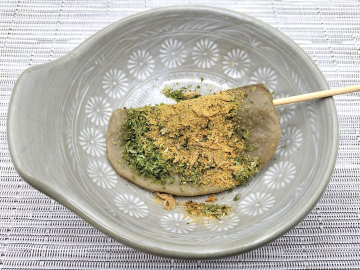 静岡おでんの代表格でもある黒はんぺんに、削り粉とあおさをかけて食べてみました。たらなどの白身魚ではなくさばやいわし、あじなどの青魚を原料にしているので黒いはんぺんになるのですが、名前ははんぺんなのにあのフワフワ感は全くなく、かまぼこに似たしっかりとした食感です。そこに削り粉の魚の旨味とあおさの風味が重なって、海のおでんなんだなと感じました。確かに海産物が獲れるからこそすり身ができるのですが、他の地域とは違った静岡おでんがずっと地元で愛されている理由がわかったような気がします。