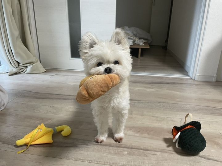 遊びの誘い方がもう人間のようですね。自分が遊びたいおもちゃをくわえて、 じーっと飼い主さんのことを見つめる作戦です。この作戦はあまりにかわいすぎてすぐにお手上げになっちゃいそうです。この投稿には「癒されました」「おもちゃ並んでてかわいい」といったリプライがついていました。