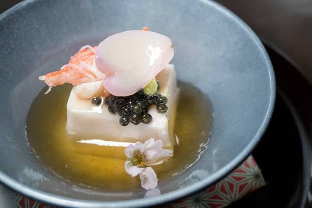 1人に1皿、前菜も用意。この日はちょうど桜の季節だったので、桜の香りを楽しめる「ごま寄せ豆腐」を提供。蟹やキャビアも盛り付けられた、美的でプチゴージャスな一皿です。