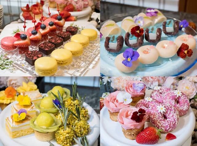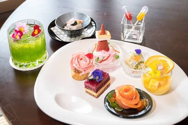 カフェに並ぶタパスとスイーツもフォトジェニック。6種類のタパスと13種類のスイーツから、好きな6種類を自由に選んで、パレットにみたてた白いお皿に盛り付ける “花寄せパレット” が楽しめます。どれもプリンスホテルクオリティの美味しさです。