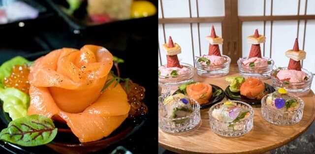 バラの花そっくりな「スモークサーモンローズ」は、鱒の卵やレッドソレルの葉を飾り、金粉を振りかけて煌びやか。