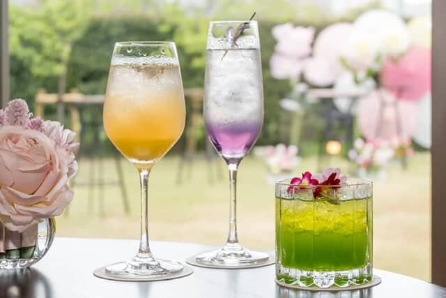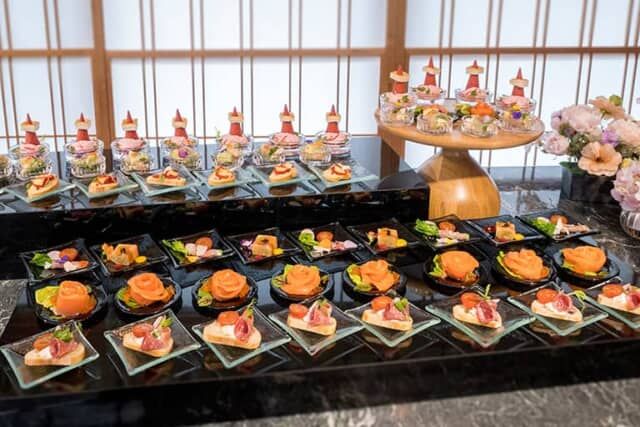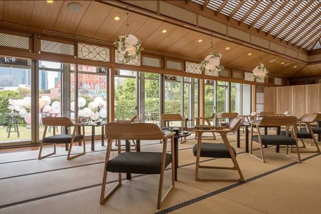 会場は、普段神前式で利用する神殿「神明」。窓の外には緑豊かな庭園が広がり、外に出て景色や写真撮影も可能です。2日前までの予約制で、和のミニ前菜と19種類のスイーツやタパスから6種類を選んでお皿に盛る “花寄せパレット”、さらにワンドリンクがついて1名¥5,000で楽しめます。