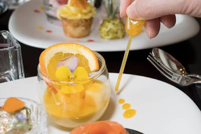 テーブルに用意された、ラズベリーとオレンジのソースで好きな模様を描けます。