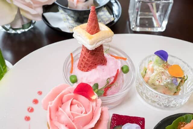 「タワーポテトサラダ」は、ビーツで桜色に染めたポテトサラダをベースに使い春色に。フランボワーズのバタークリームで作られたバラの花のフラワーマフィンも素敵です。