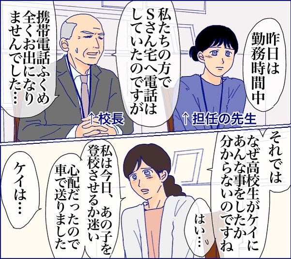ショックで語彙力が追いつかず、上手く伝えられないまま、SさんとSさんのお母さんに所へ連れて行かれ、ケイくんはボロボロ泣きながら、3人の前で謝ったということでした。