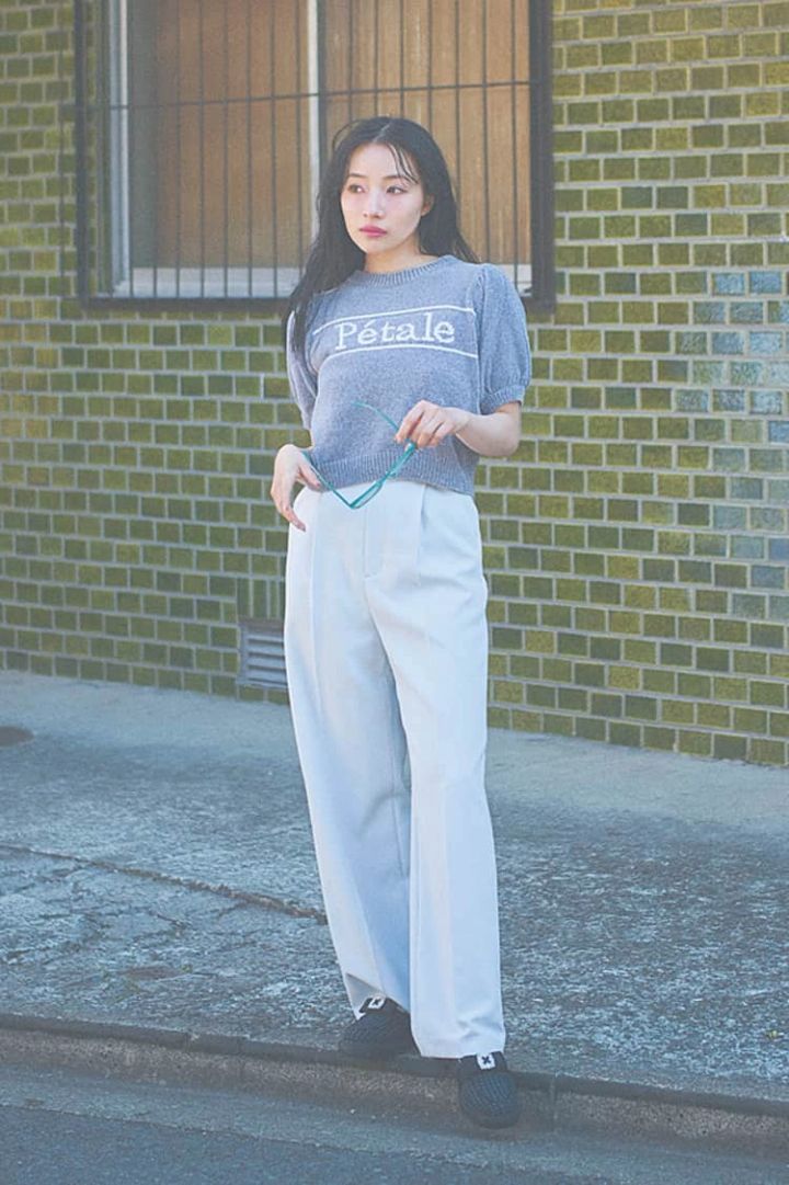 そでのふわっとしたシルエットが、パンツあわせのクールさをやわらげてくれる。小物で色を差せば一気にあか抜けた印象に仕上がる。