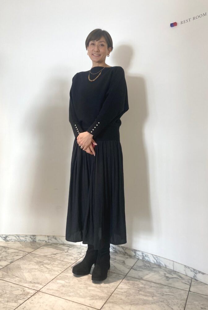 「今回は誕生日パーティということで主役がいるので、ブラックのワントーンコーデで主役を引き立てる装いに。お祝いの席なので、アクセサリーなどで派手になり過ぎない華やかさを出すようにしました」。黒で統一することでIラインを意識して、高身長が映えるスタイルアップコーデに。パーティの趣旨を考えて、落ち着き過ぎず派手過ぎない着こなしをされています。