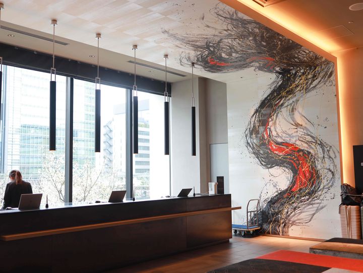 2階から施設内に入ると、赤が効いたエレガントかつ力強さも感じるアートが施された壁紙に目を奪われます。遊び心を散りばめつつ、大人のための上質で落ち着いた雰囲気も漂う非日常空間です。
