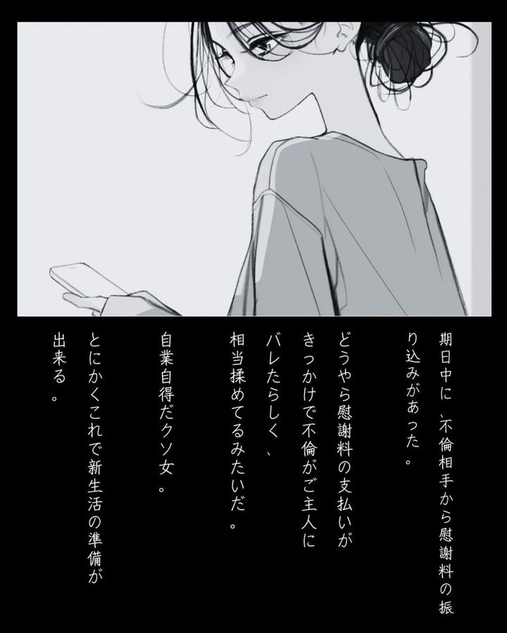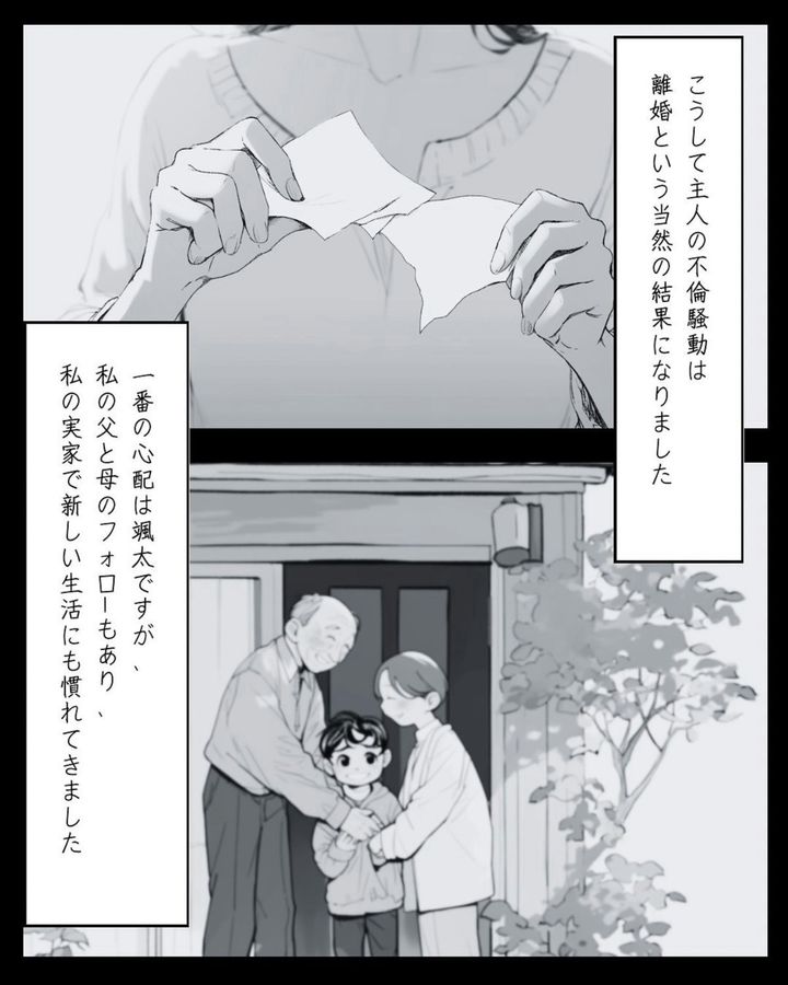 夫との離婚が無事に成立し、不倫相手からも慰謝料の振込確認ができました。息子とともに、新しい生活をスタートさせた美咲。実家の助けもあり、順調に新生活になじんだようですね。「ママはあなたがいるから幸せ」という最後のシーンから、美咲の母としての強さを感じます。