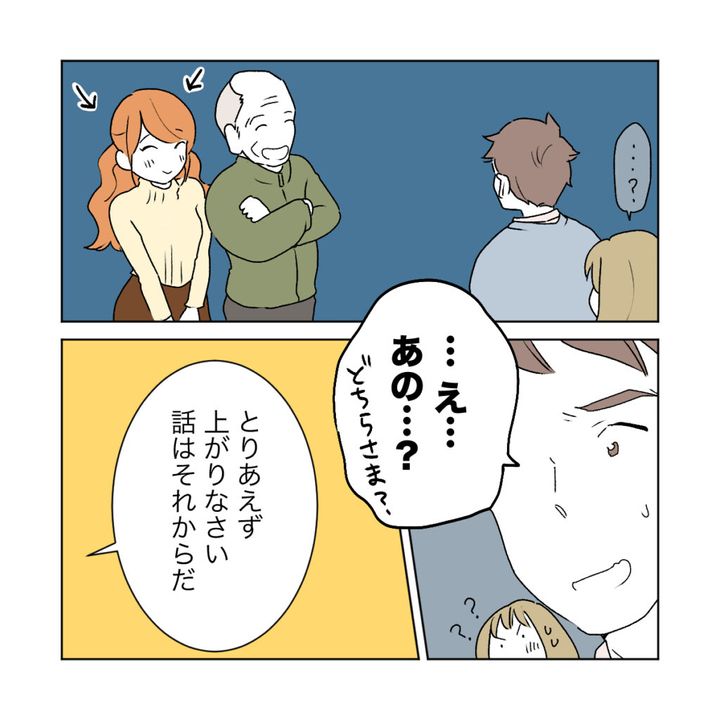 ナツさんが「誰だろう?」と不思議に思っていると、隣のカナメさんも「・・え・・あの・・?どちらさま?」と戸惑っており、その場に流れる何とも言えない空気にナツさんはますます困惑。すると「とりあえず上がりなさい。話はそれからだ」と義父が言いました。