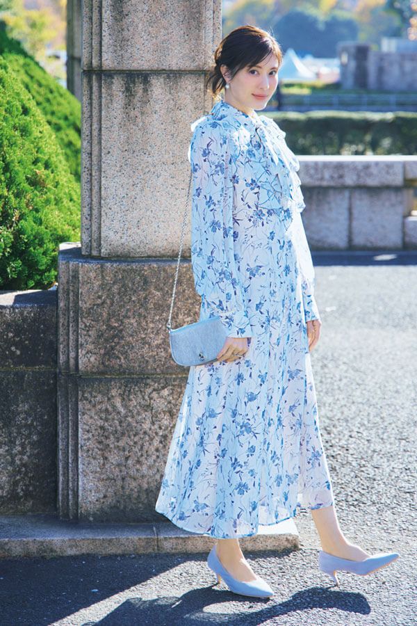 ワンピース¥18,480/MERCURYDUO(MERCURYDUO ルミネエスト新宿店) バッグ¥45,100/ジャンニ キアリーニ(ジャンニ キアリーニ 銀座店) ピアス¥7,260/チビ・ジュエルズ(チビジュエルズ・ジャパン) リング[右手人さし指]¥19,800/masae、リング[右手中指]¥2,750/ヘンカ(ともにロードス) パンプス¥2,090/神戸レタス
