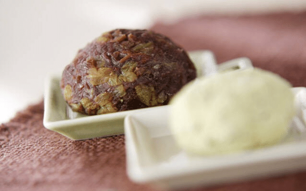 中にクリームチーズが入れる洋風の大福です。クリームチーズはラムレーズン、オレンジの皮入りで香り豊か。外側は、レンジ加熱した餅を砂糖と混ぜてこね、片栗粉で丸めて作ります。抹茶やココアパウダーをまぶし、2種類の味を楽しみましょう。