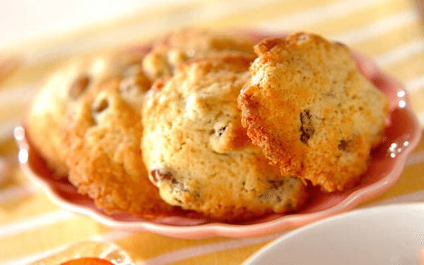 たっぷりのラムレーズンをが入った、大人向けのクッキー。バターとショートニングを半々で使うと、サクサク軽い食感に仕上がります。生地ができたらそのままスプーンで天板にのせるので、生地のねかしも型抜きも不要でお手軽にできますよ!