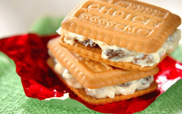 ハチミツを加えて柔らかくしたクリームチーズにラムレーズンを混ぜ込んだら、クッキーにはさみます。濃厚さと豊かな香り、クッキーの食感が合わさり、手が止まらなくなるおいしさ! コーヒーや紅茶と一緒に楽しみたいリッチ感あふれる一品です。