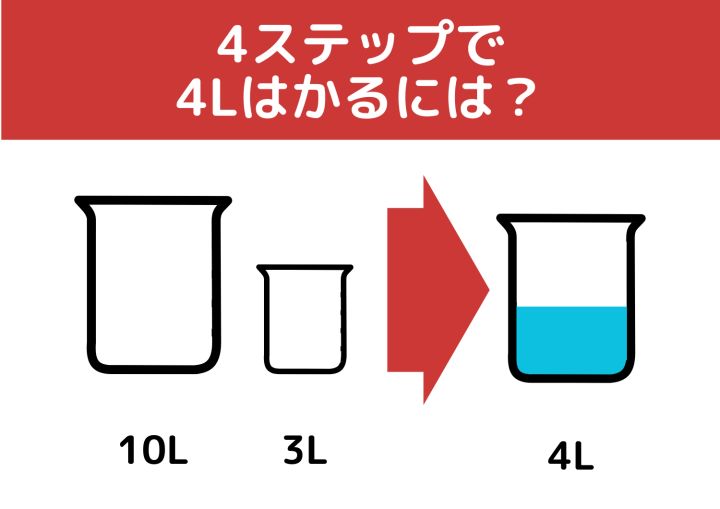 3. 【クイズ】4ステップで答えまで辿り着ける!「10Lと3Lの容器で4L」をはかるには?