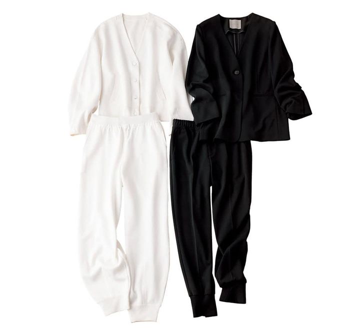 <右>上下ストレッチで着疲れなし!ブラックジャケット¥14,990ジョガーパンツ¥7,990(ともにアンフィーロ)<左>ホワイトニットカーディガン¥24,200パンツ¥24,200(ともにスタニングルアー/スタニングルアー 新宿店)