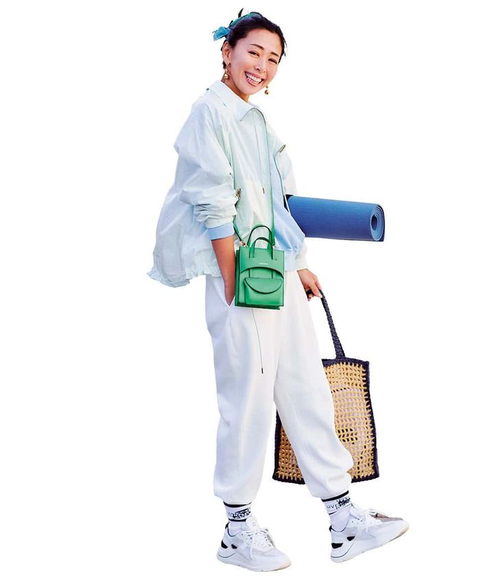 ニットパンツ(着回し)¥33,000(ソブ/フィルム)ブルゾン¥79,200(タトラス/タトラス 銀座店)ロゴスウェット¥25,300(THIRD MAGAZINE)Tシャツ¥8,800(デミルクス ビームス/デミルクス ビームス 新宿)スカーフ¥22,000(マニプリ)ポシェット¥31,900〈ハイドシンス〉スニーカー¥39,600〈デイト〉(ともにティースクエア プレスルーム)メッシュトートバッグ¥45,100(カテリナ・ベルティーニ/essence of ANAYI)ソックス¥2,750(ウェスタン ハイドロダイナミック リサーチ/WEAVA)ピアス¥24,200(ベン・アムン/ZUTTOHOLIC)