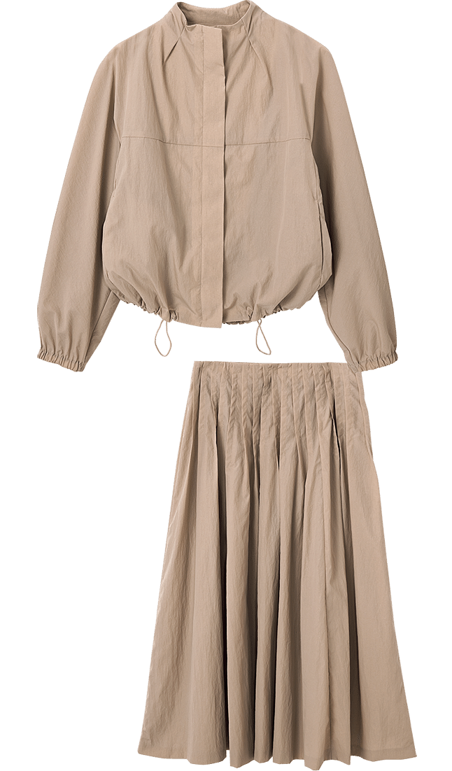 綺麗なグレージュに惹かれるブルゾンは、同素材のスカートとセットアップで着るとさらにモダンに。¥69,300 (エステータ/オンワード樫山 お客様相談室)、5 フェミニンなフォルムでテック系素材を取り入れるのもあり。腰回りのボリュームをおさえるよう計算されたデザインも秀逸。¥49,500 (エステータ/オンワード樫山 お客様相談室)