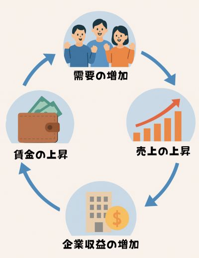 健全なインフレは、需要の増加 → 売上の増加 → 企業収益の増加 → 賃金の上昇 → 家計の消費拡大 → さらに需要が伸びる、というポジティブな循環を示す状況です。
