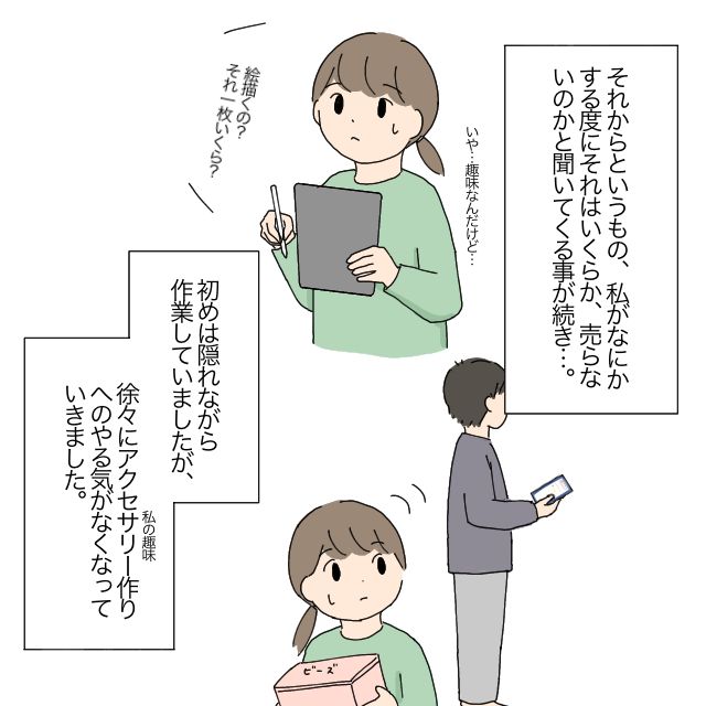 それからというもの、私が何かする度に、それはいくらか、売らないのかと聞いてくる事が続き・・初めは隠れながら作業していましたが、徐々にアクセサリー作りへのやる気がなくなっていきました。