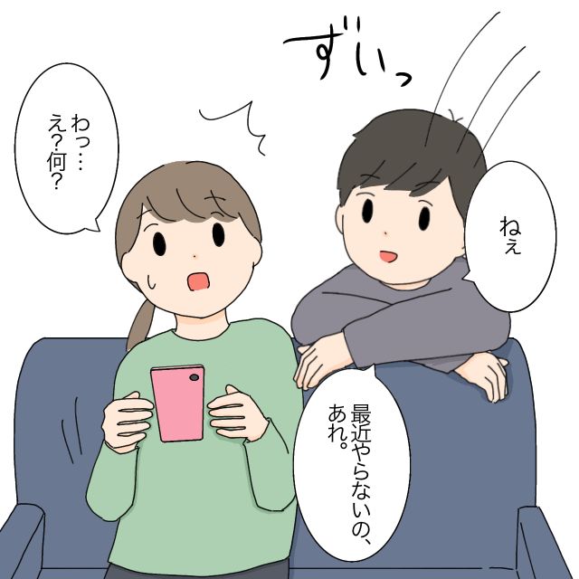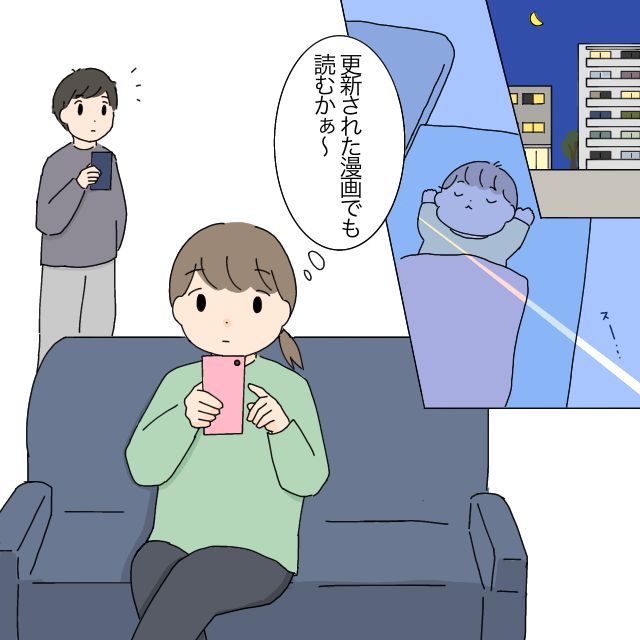 「更新された漫画でも読むかぁ~」かなえさんがソファに座りスマホを触っていると、