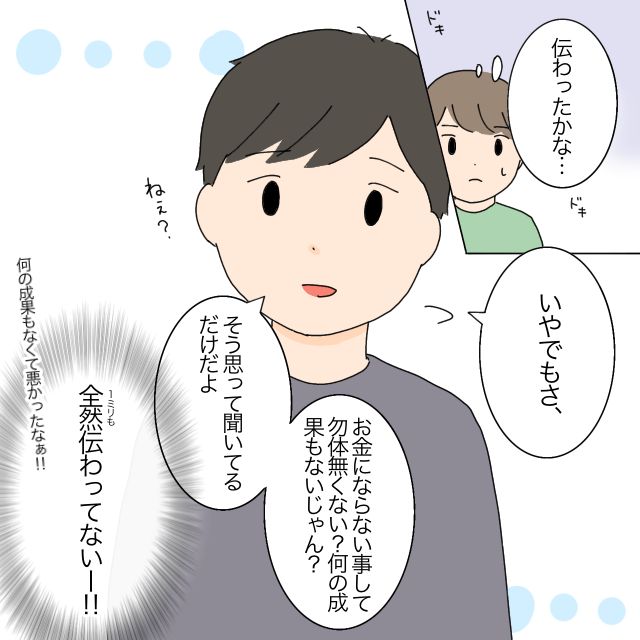 「伝わったかな・・」とドキドキしていると、「いや、でもさ、お金にならない事して勿体無くない?何の成果もないじゃん?そう思って聞いてるだけだよ」平然とそう言うたかしさん。かなえさんは、「全然伝わってないー!!何の成果もなくて悪かったなぁ!!」と心の中で呟きました。