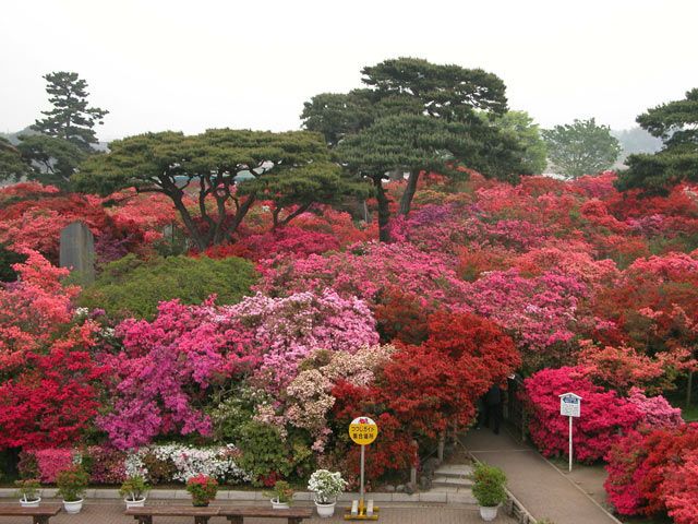 「つつじが岡公園(つつじがおかこうえん)」は、推定樹齢800年のヤマツツジの巨樹が見られるツツジの名所。城沼(じょうぬま)のほとりにある12.9haの園内では、見頃を迎える4月中旬から5月上旬にかけて、100余品種約1万株ものツツジが咲き誇る絶景に出合えます。毎年4月上旬から5月上旬には「つつじまつり」を開催。国の名勝にも指定されています。