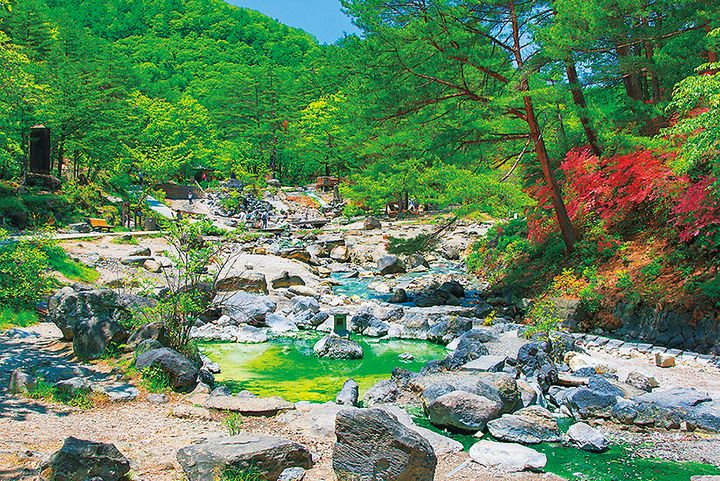 新緑や紅葉が美しい水上峡沿いに旅館が立ち並ぶ