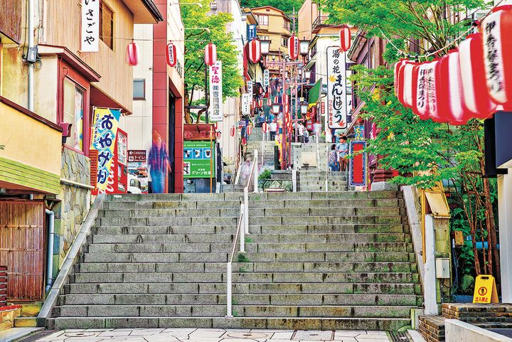 「石段街(いしだんがい)」は、戦国時代末期から400年以上も続く伊香保温泉のメインストリート。365段の石段は、下から見上げるとそのスケールに圧倒されます。老舗の湯宿をはじめ、一帯にグルメやショップが立ち並び、昭和レトロな風情を今に残しています。
