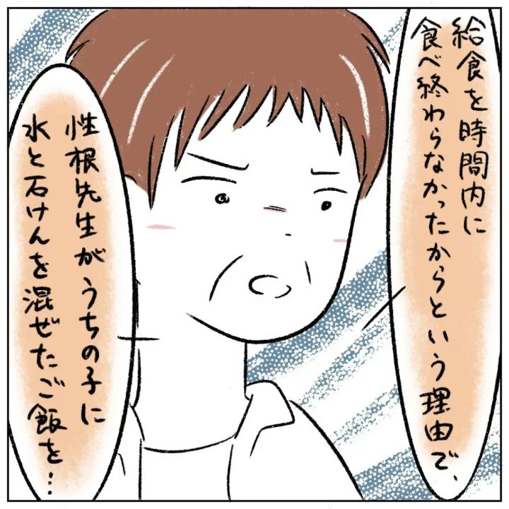「給食を時間内に食べ終わらなかったからという理由で、性根先生がうちの子に水と石けんを混ぜたご飯を・・」