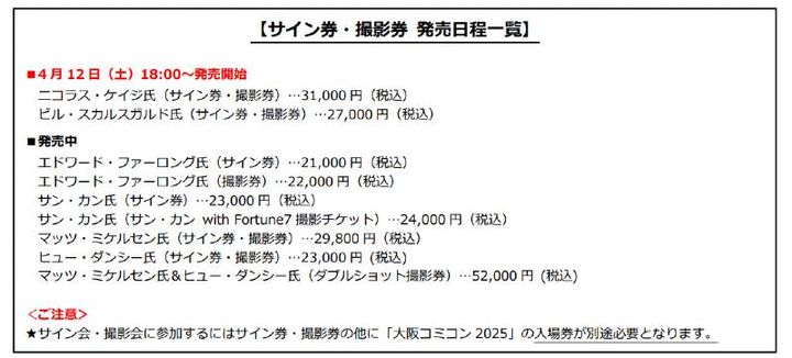 ニコラス、ビルのサイン券・撮影券は、2025年4月12日(土)18:00よりチケットぴあ及びハリコンサイトの両サイトにて発売開始となり、ニコラスのサイン券・撮影券は31,000円(税込)で、ビルのサイン券・撮影券は27,000円(税込)で購入可能。