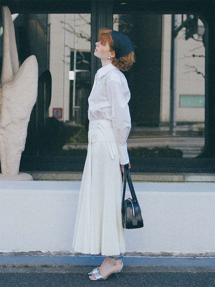 【POINT】オール白でも可愛くならない、舞わないプリーツスカート。クラシックな黒小物で全体を引き締めるほか、白の延長で使えて奥行きをもたらす、ツヤっとしたシルバーづかいがポイント。