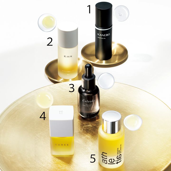 オイルには角質柔軟効果があるので、肌がゴワついた人にお勧め。肌の皮脂の組成と近いオイルが浸透を促します。オイル自体の必須脂肪酸が乾燥や肌が薄くなることを防ぎ、マッサージをすることで血行を促して肌ぐすみ解消も可能。美容成分とオイルの2層タイプは、ビタミンなどの水溶性美容成分も肌内部に連れていき、ベタつきもありません。