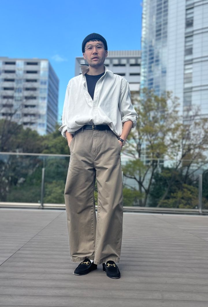 「今回はベルトも靴も茶で揃えてしまいましたが、黒以外のベルトは茶靴と合わせてもOK。たとえば、スニーカーで合わせている(次ページで紹介)ガチャベルトとも相性がいいんですよね。なので、茶靴の場合は色や素材の質感の違いにそこまで神経質にならず、自由に合わせてみてください。意外な発見もあるかも! 」