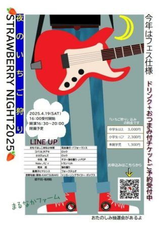 ストロベリーナイト2025。なんと夜のいちご狩りが音楽イベントと同時に開催‼幻想的な夜のいちご狩りと演奏される皆さんの心のこもったステージが期待できそうです‼