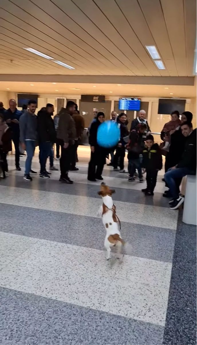 空港で注目の的となっているイヌ。 誰よりも楽しそうに跳ね回るその無邪気な姿に、周囲の人たちは思わず笑顔になり、カメラを向けている人も大勢いました!!