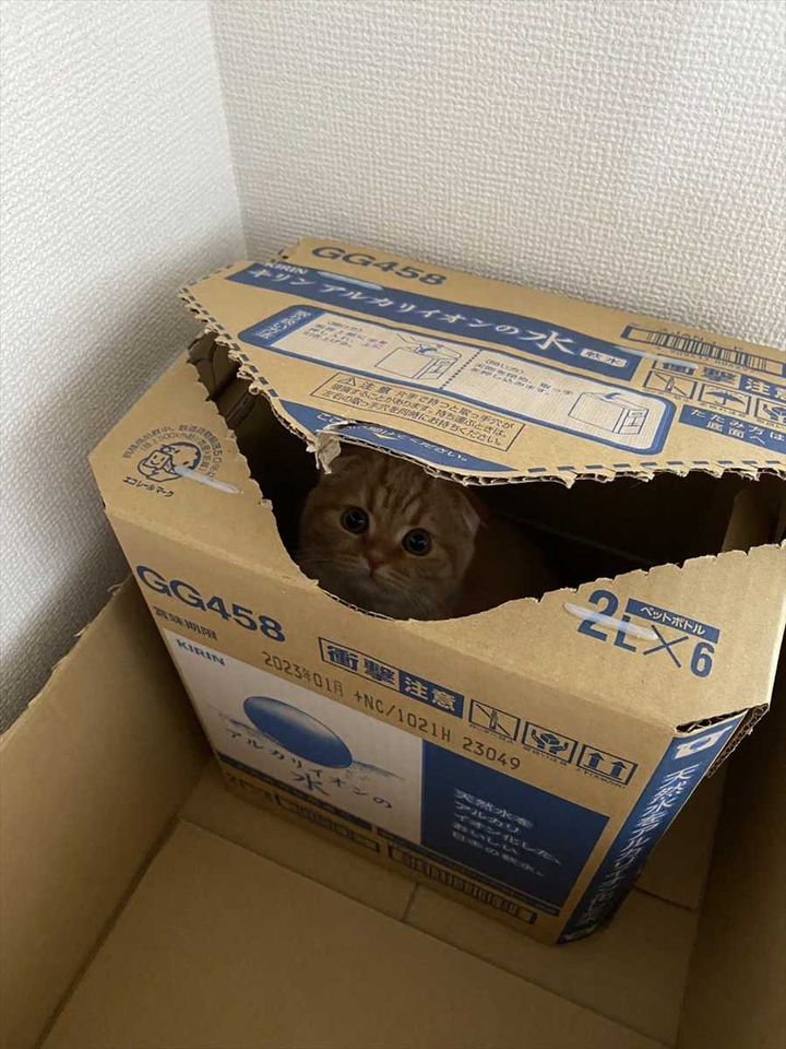 ・ダンボールに隠れて、ピョコっと出てきたネコがめっちゃいいですね!