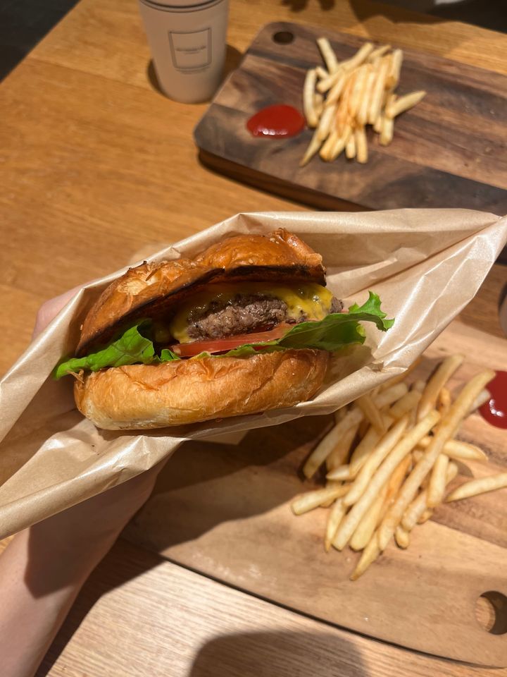 牧草牛100%パティの中に、チェダーチーズ・オニオンレリッシュ・トマトが入っていて、一口食べるごとに幸せな気分に。