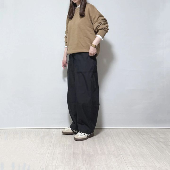 まずご紹介するのは、コロンとしたキュートなシルエットが特徴の「ワイドバルーンパンツ」。動きやすくトレンドを押さえたサイズ感と、絶妙なカラーが魅力のアイテムです。シルエットにこだわっていながらシンプルなデザインのため、合わせやすいのもおすすめポイント!