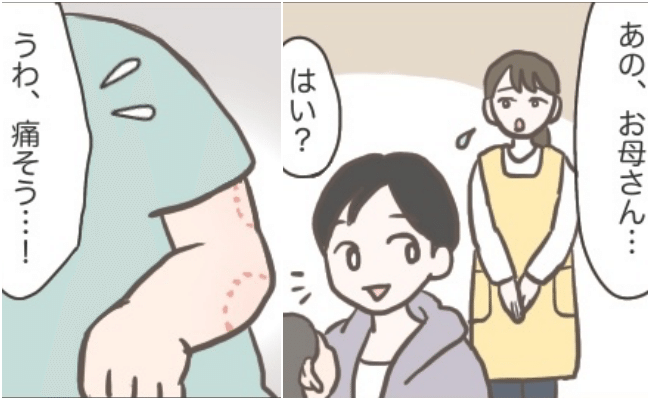 保育園に通い始めてからしばらく経ったある日、保育士さんが申し訳なさそうな顔で話しかけてきました。聞いてみると、息子が腕をお友だちに噛まれてしまったとのこと。痛々しく歯形のあざができていて、痛かっただろうな……と思いました。