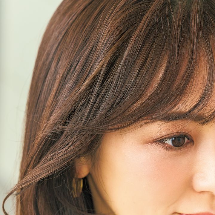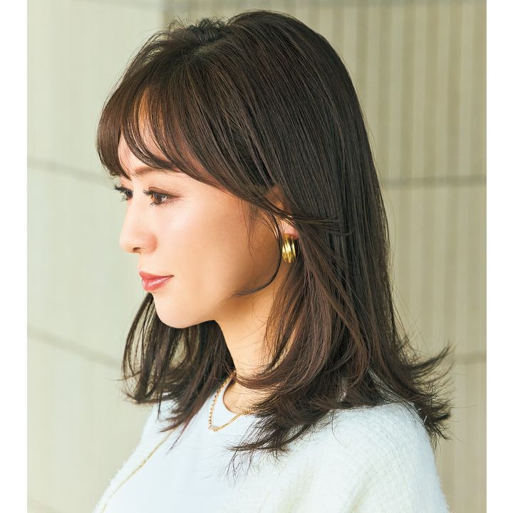 前髪とサイドバングで顔の余白を埋めて小顔を演出するなら、眉尻が隠れるくらいがベスト。やりすぎると、逆に顔の印象が暗く見えます。